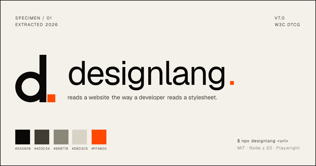 designlang is an open-source CLI that reverse-engineers any website into a complete design system — W3C DTCG tokens (primitive, semantic, composite), Tailwind, CSS variables, Figma variables, shadcn/ui theme, React / Vue / Svelte themes, iOS SwiftUI, Android Compose, Flutter, WordPress block theme, plus a stdio MCP server for Claude Code, Cursor, and Windsurf. CSS health audit, WCAG remediation, semantic region classifier, reusable component clustering, dark-mode diff, auth-gated crawling. One command, zero install.