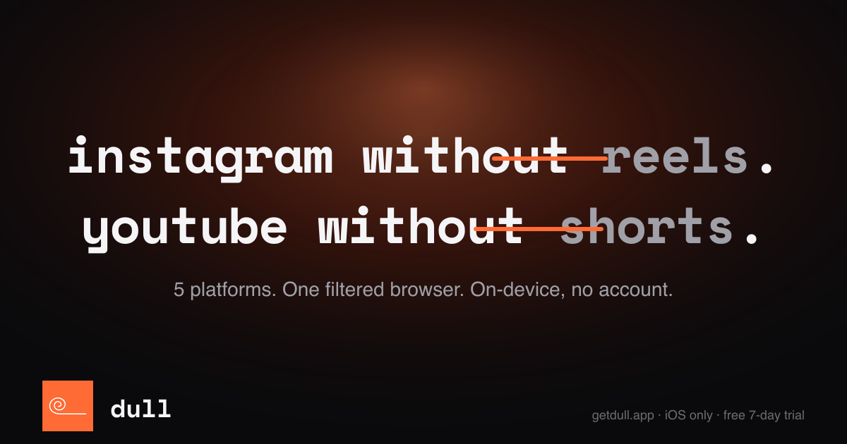 - getdull.app is a community website from Global indexed by NeighborhoodTreasure on April 25, 2026. Reels gone. Shorts gone. Algorithmic feeds gone. 5 platforms, time limits, friction gates, grayscale, widgets, usage tracking. All on-device.